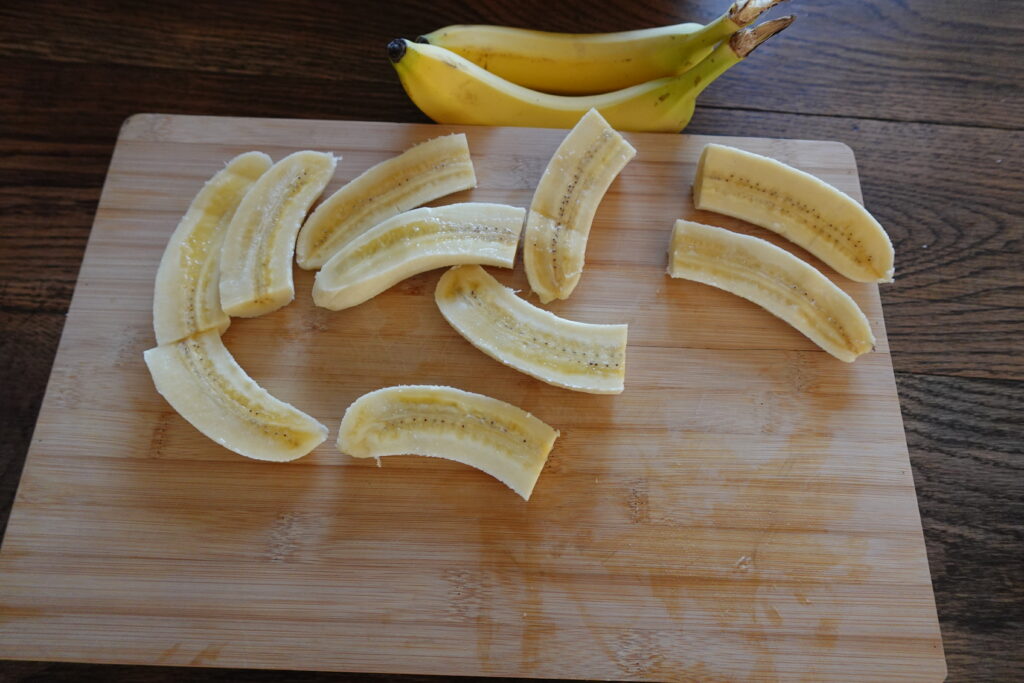 2. Peel and cut bananas lengthwise, then cut the sliced pieces in half. This helps them fit into the skillet better.