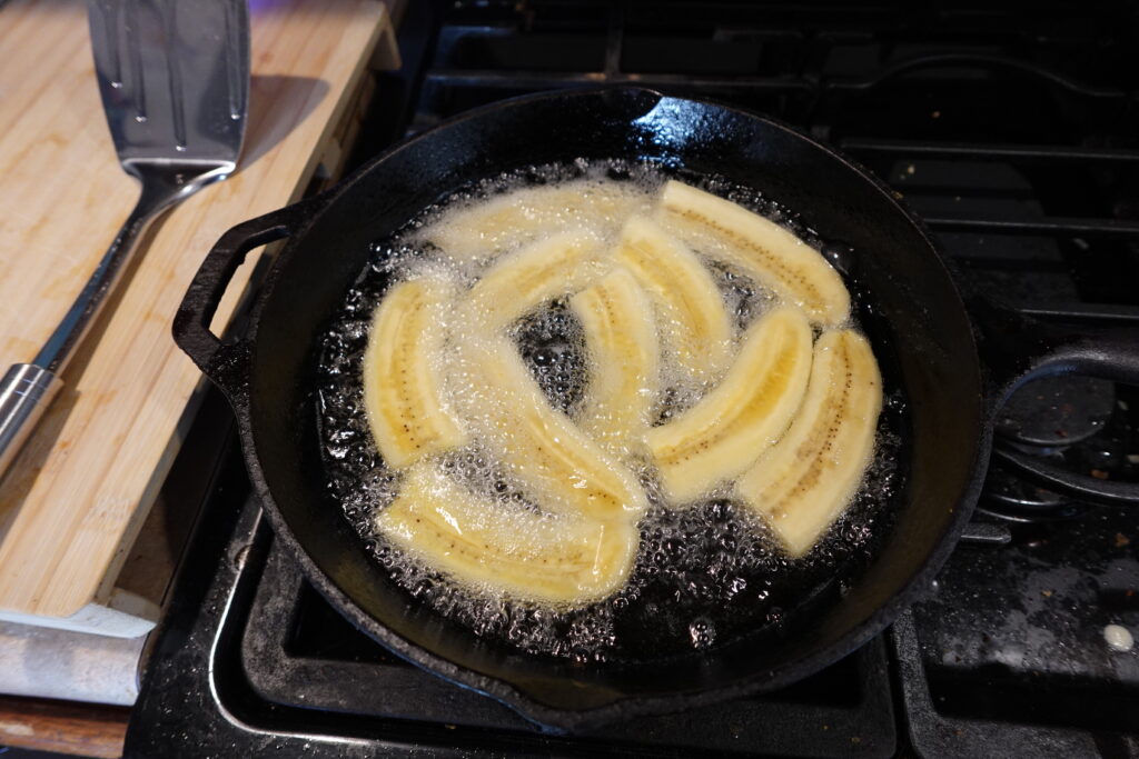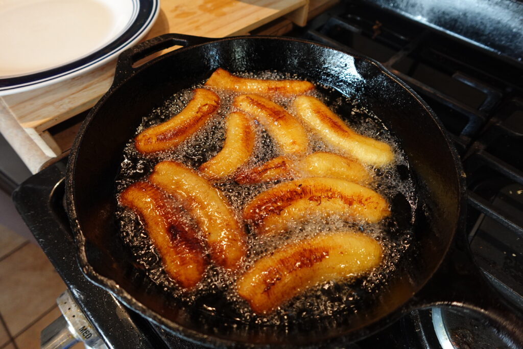 3. Next, carefully place bananas in hot oil, frying about 5 minutes on each side.